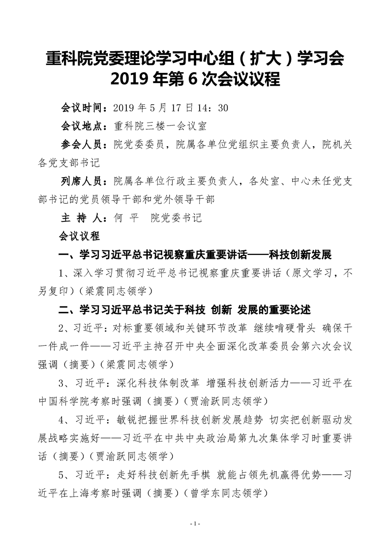 重科凯发k8官网2019年第6次中心组(扩大)学习会会议议程
