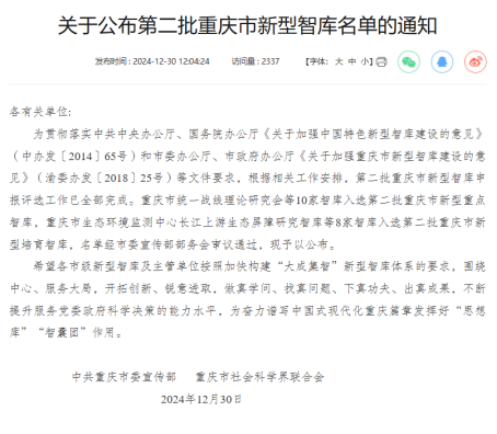 院战略院公司入选第二批重庆市新型智库